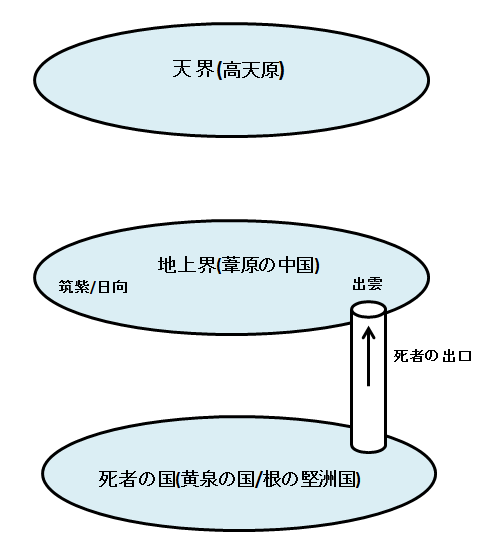 天界(高天原)、地上界(葦原の中国)、そして死者の国(黄泉の国)。黄泉の国は、根の堅洲国(ねのかたすくに)とも呼ばれます。黄泉の国と根の堅洲国の違いは、現時点では不明。とにかく黄泉の国/根の堅洲国から、死者が出てくるところが出雲。出雲って、何だか不気味ですねえ。