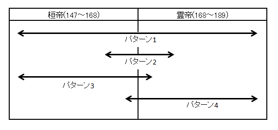 ざっくり、4パターンに分けてみました。倭国大乱は、遅くても西暦168年には始まって無ければならない。そうでなければ桓帝・霊帝の治世の間、争うことはできないから。
